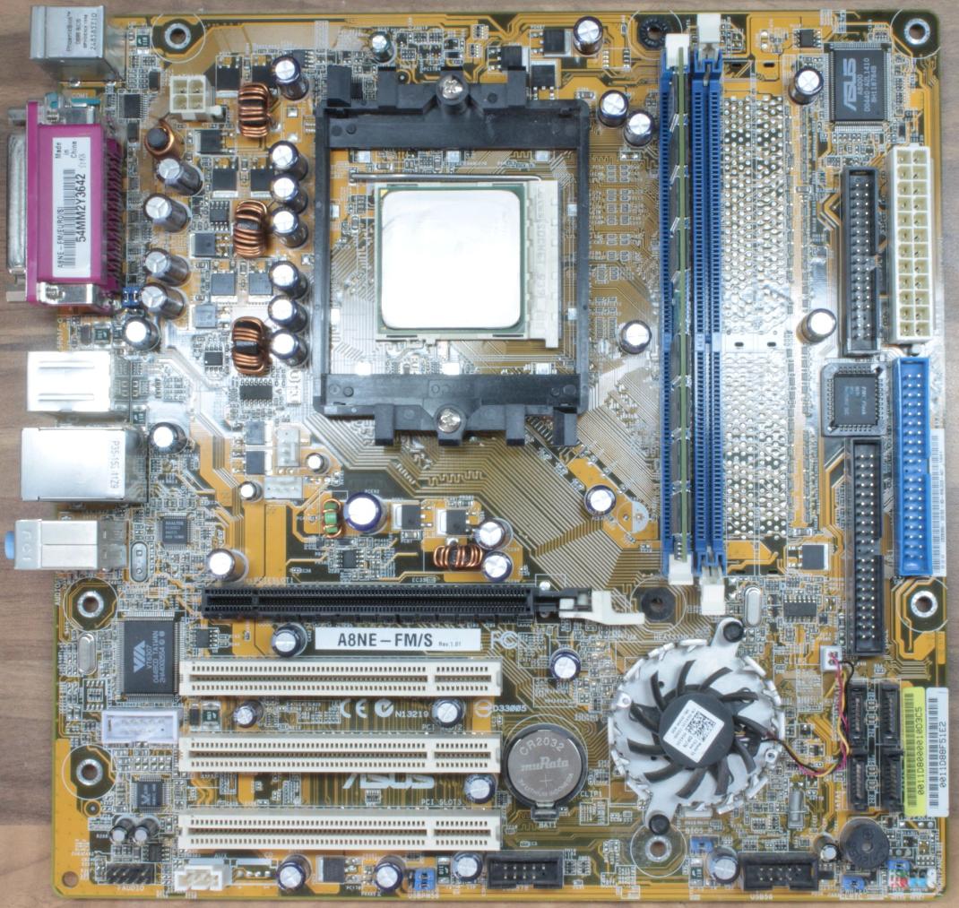 The Asus A8N-E motherboard in this computer is a reasonably respectable one. However it arrived dead and needed some reworking to resurrect it: some replacement capacitors, and the chipset fan was completely seized up and needed replacing - hence the strange GPU fan on this one instead of a proper one. The computer has a single 1GB DIMM in at the moment, which is enough for most things on Windows XP.